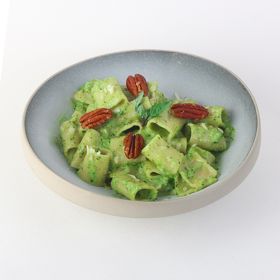 Soft penne pasta served with rich Italian pesto sauce made from fresh basil, premium olive oil, and Parmesan cheese