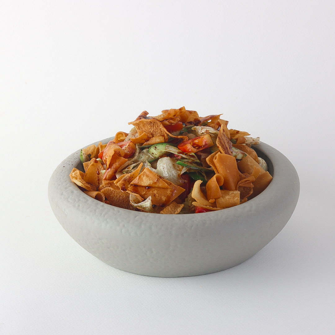 A refined Levantine salad prepared from a selection of fresh vegetables, carefully cut and mixed with a balanced lemon dressing enhanced with premium sumac. Served with delicately toasted bread that adds a golden crunch.