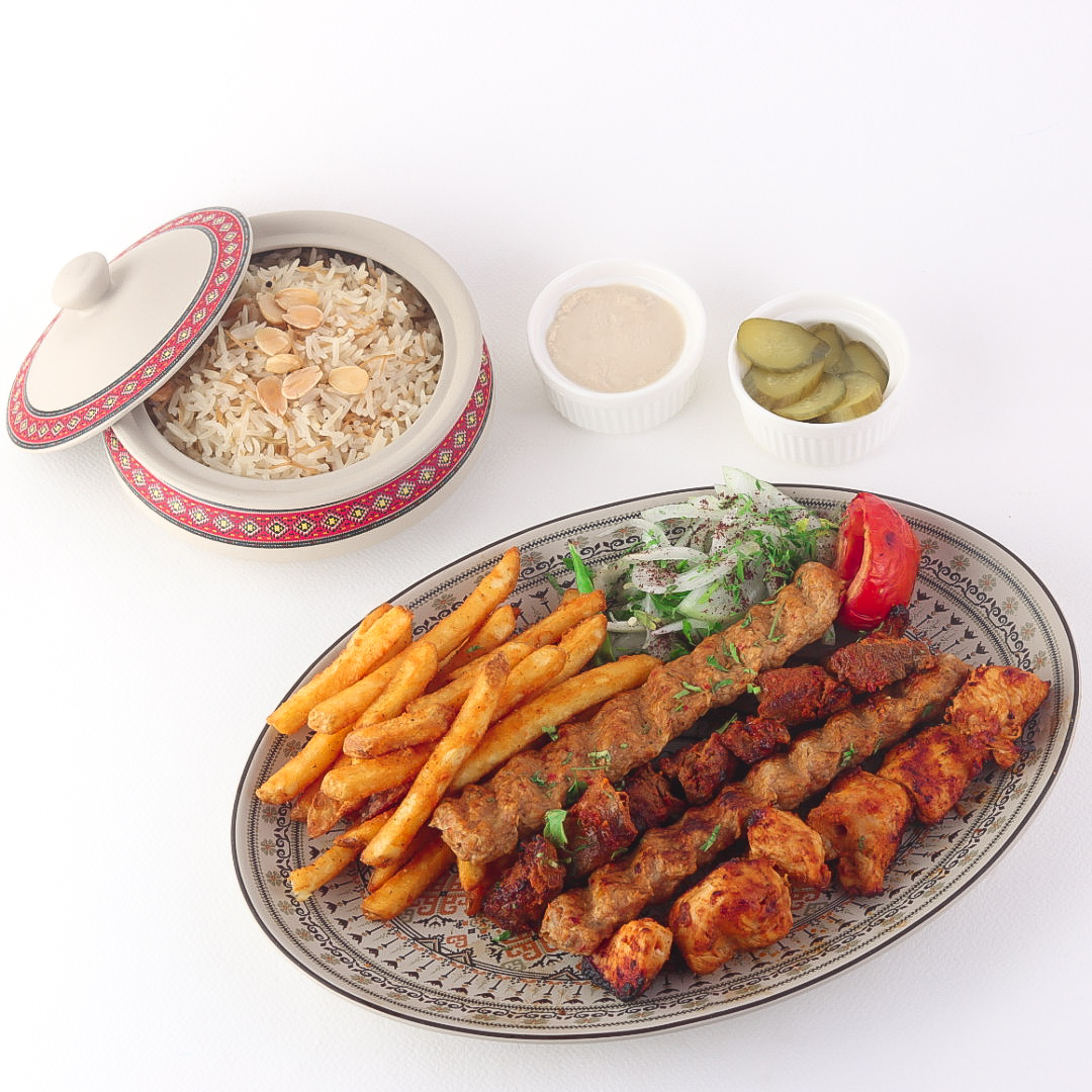 Mixed Grill Platter – A variety of grilled meats and chicken, including 10 skewers (1000 grams), served with French fries, rice, and grilled vegetables.