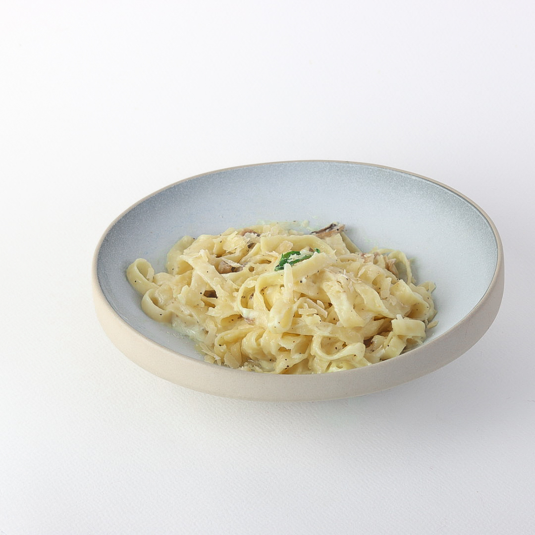 Soft fettuccine pasta coated in a rich creamy sauce with a touch of butter and signature Italian cheese, topped with perfectly grilled chicken pieces