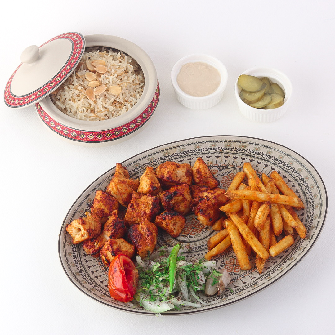 Grilled Chicken Kebab – Includes 3 skewers (300 grams), served with French fries, rice, and grilled vegetables.