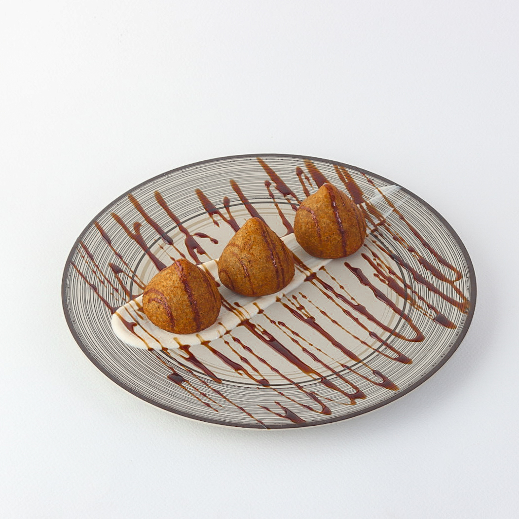 Fried kibbeh stuffed with fresh meat and premium pine nuts, served with rich pomegranate molasses sauce