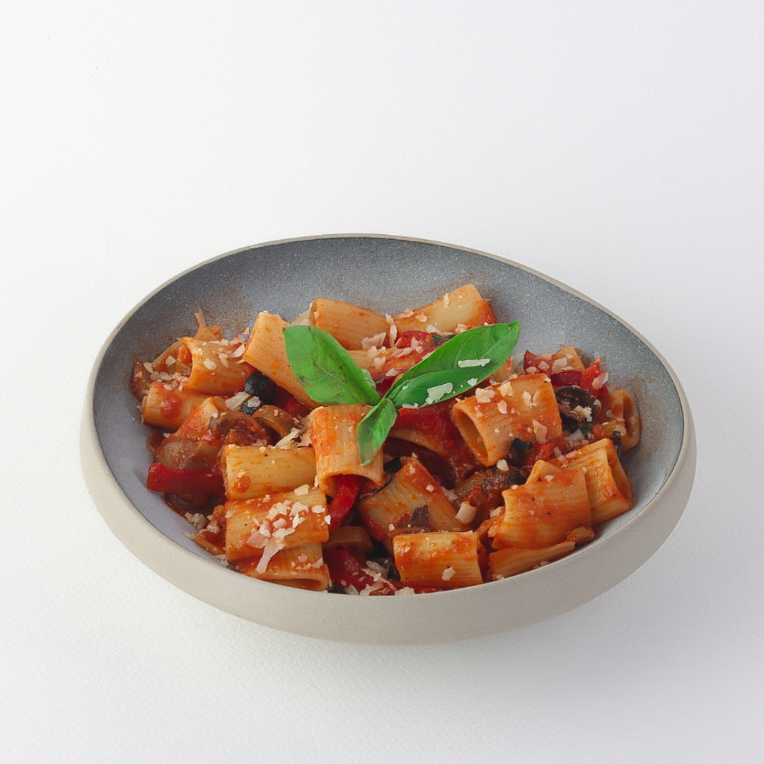Soft penne pasta served with rich tomato sauce, topped with black olives and fresh vegetables for a balanced flavor — a simple yet vibrant Italian dish full of fresh taste