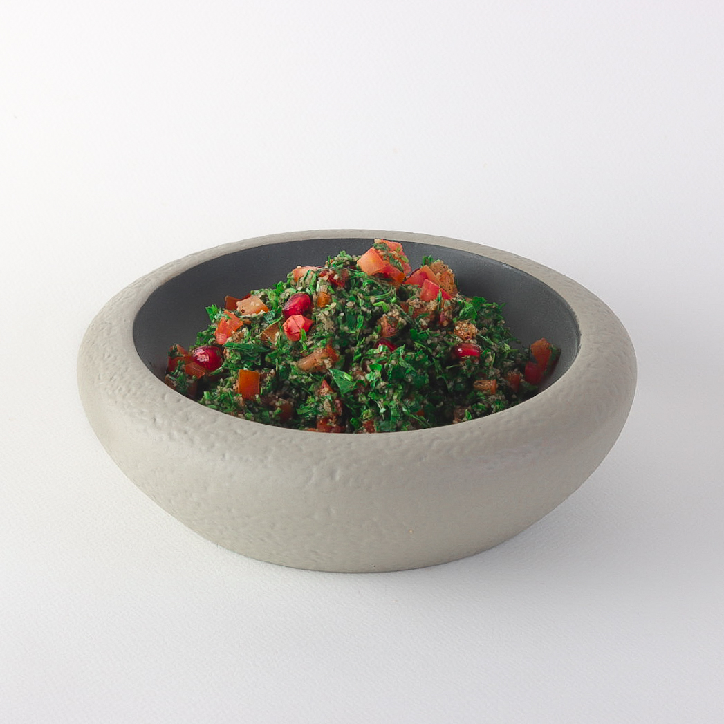 A premium Lebanese salad made from finely chopped fresh parsley mixed with fine bulgur and ripe tomatoes, seasoned with fresh lemon juice and extra virgin olive oil.
