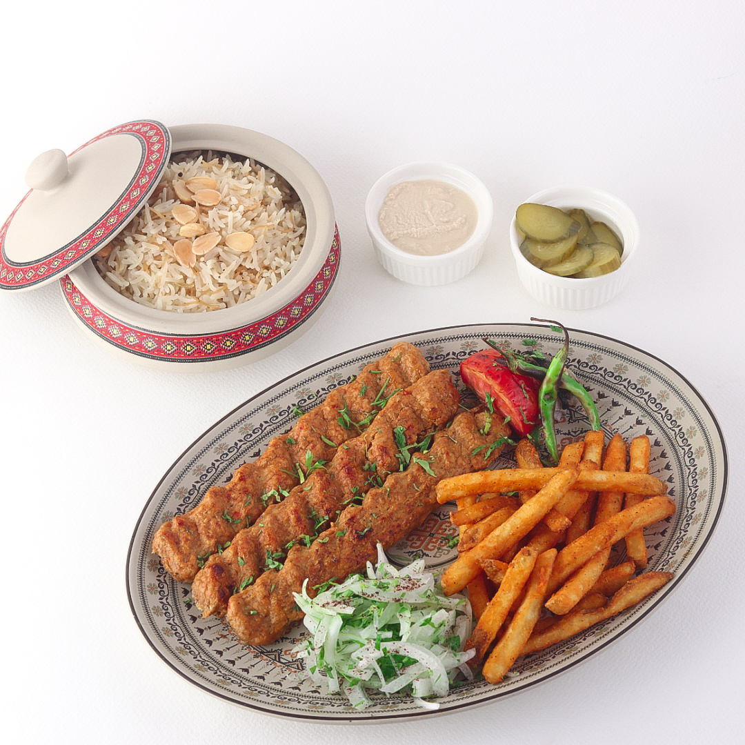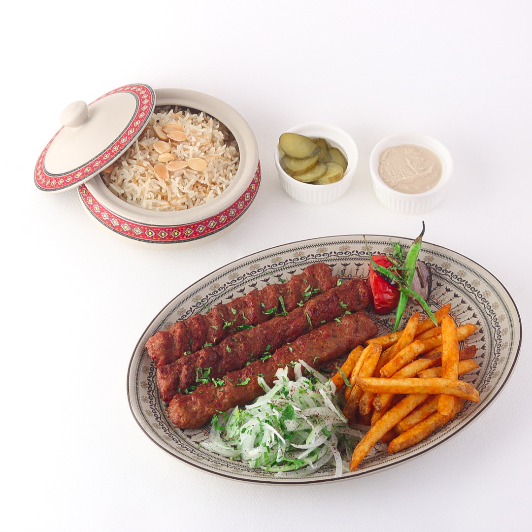 Beef Kebab – 3 skewers (300 grams), served with French fries, rice, and grilled vegetables.