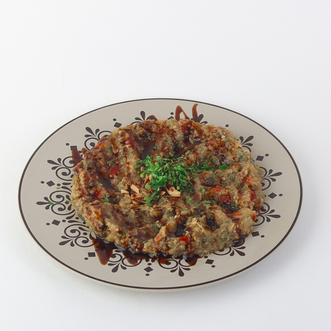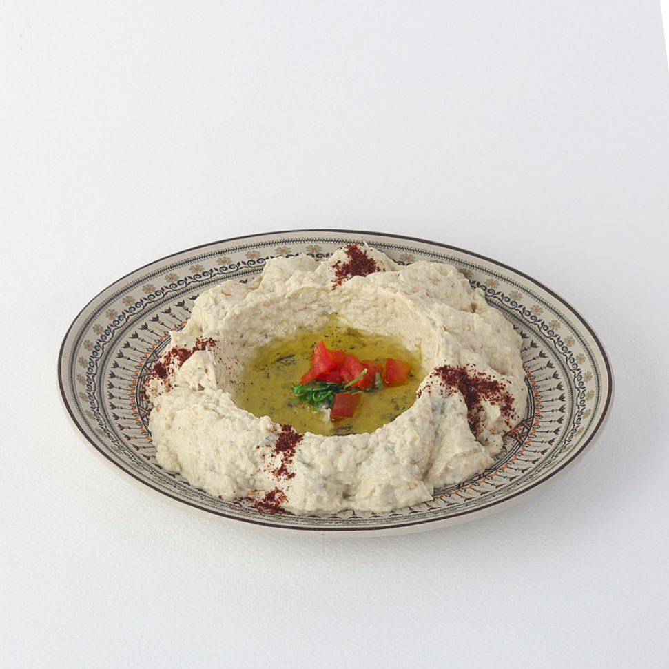 A luxurious blend of roasted mashed eggplant with creamy tahini and fresh lemon, mixed with extra virgin olive oil for a rich authentic flavor.