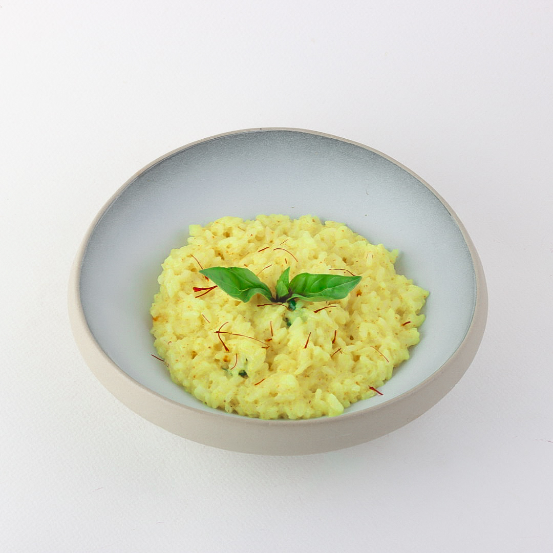 Creamy rice carefully cooked with a touch of premium saffron, giving the dish a golden color and rich luxurious flavor, topped with fresh Parmesan shavings