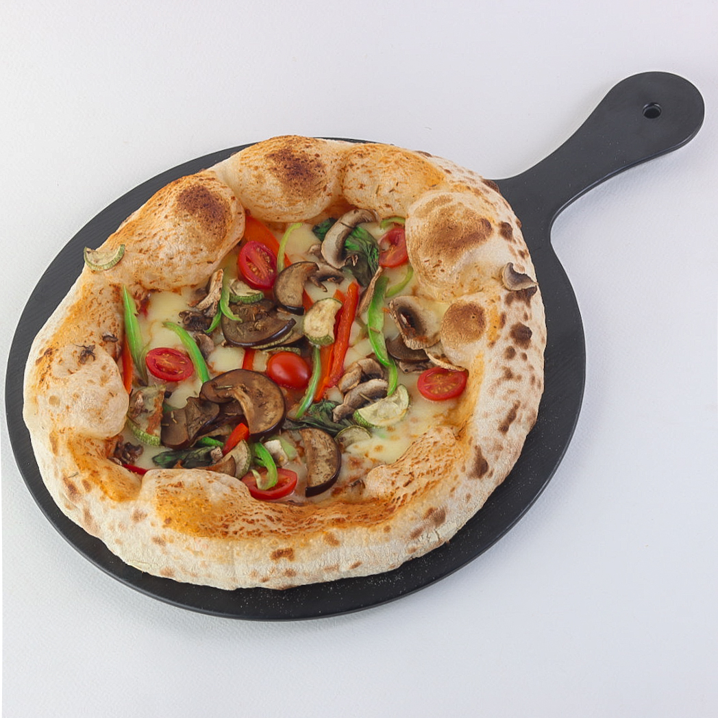 Soft and crispy dough topped with fresh tomato sauce, mozzarella cheese, and a mix of fresh vegetables.
