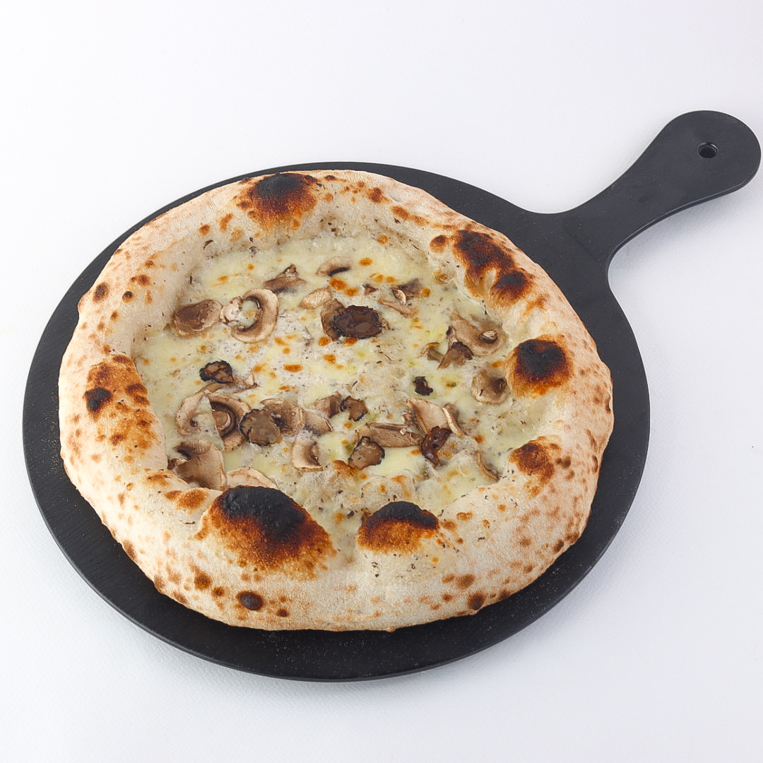Thin and crispy dough topped with rich cream sauce, premium mozzarella cheese, and black truffle oil for a luxurious and unique flavor.